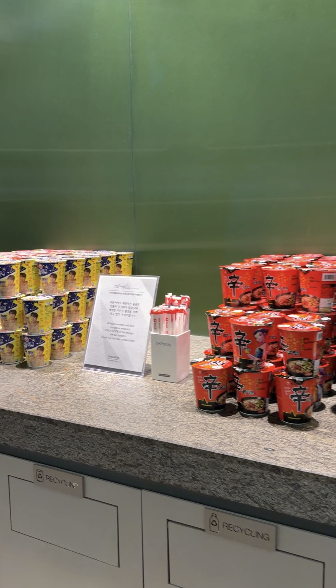 Stacks on stacks of ramen in the Asiana Business Lounge EAST