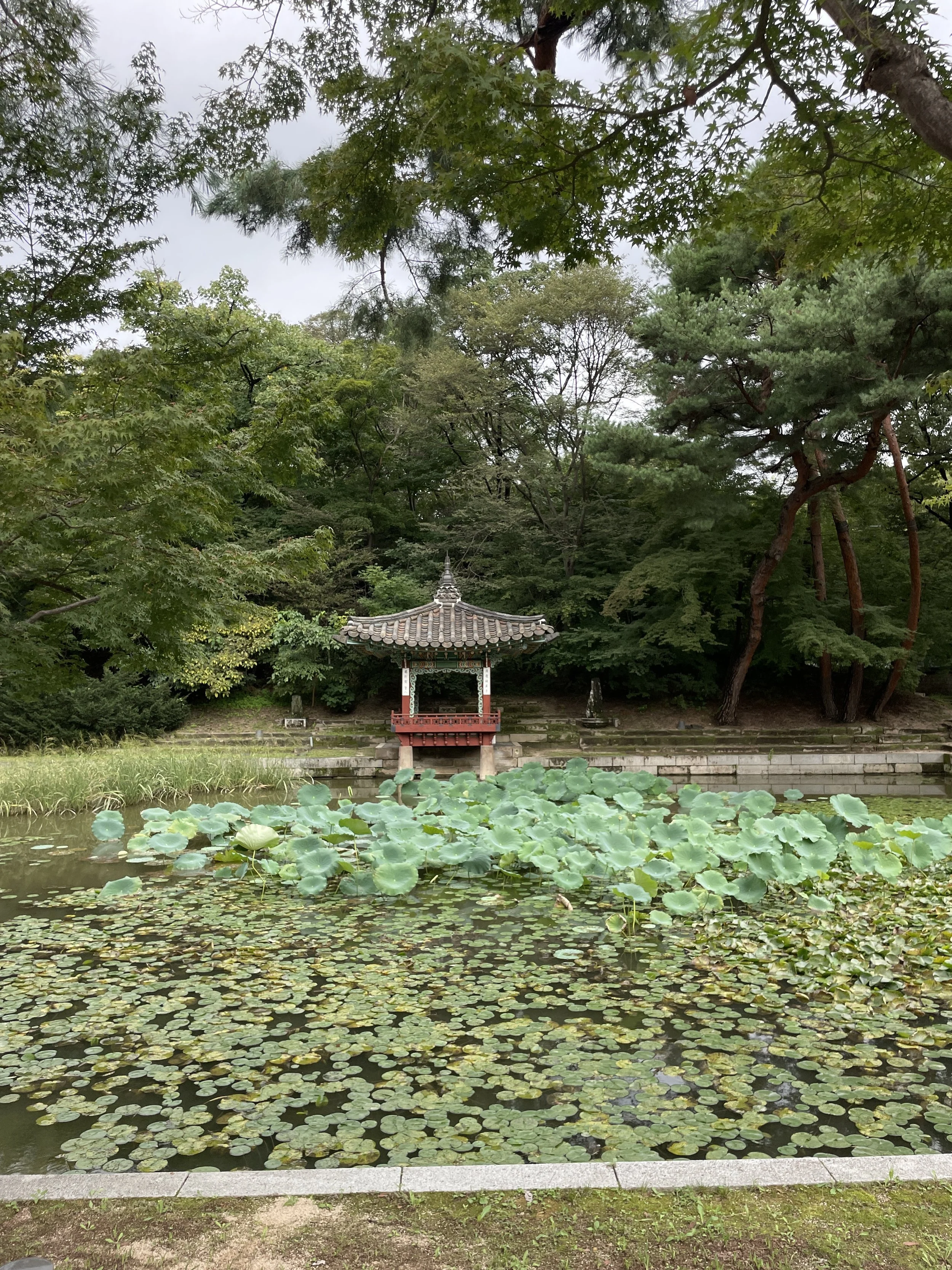 Once several different ponds, they were all combined into one curved pond during the Japanese occupation. Each of the pavilions surrounding the pond are unique. Jondeokjeong has a two-tiered hexagonal roof, Gwallamjeong has a fan-shaped roof, and Pyeomusa has a gambrel roof.