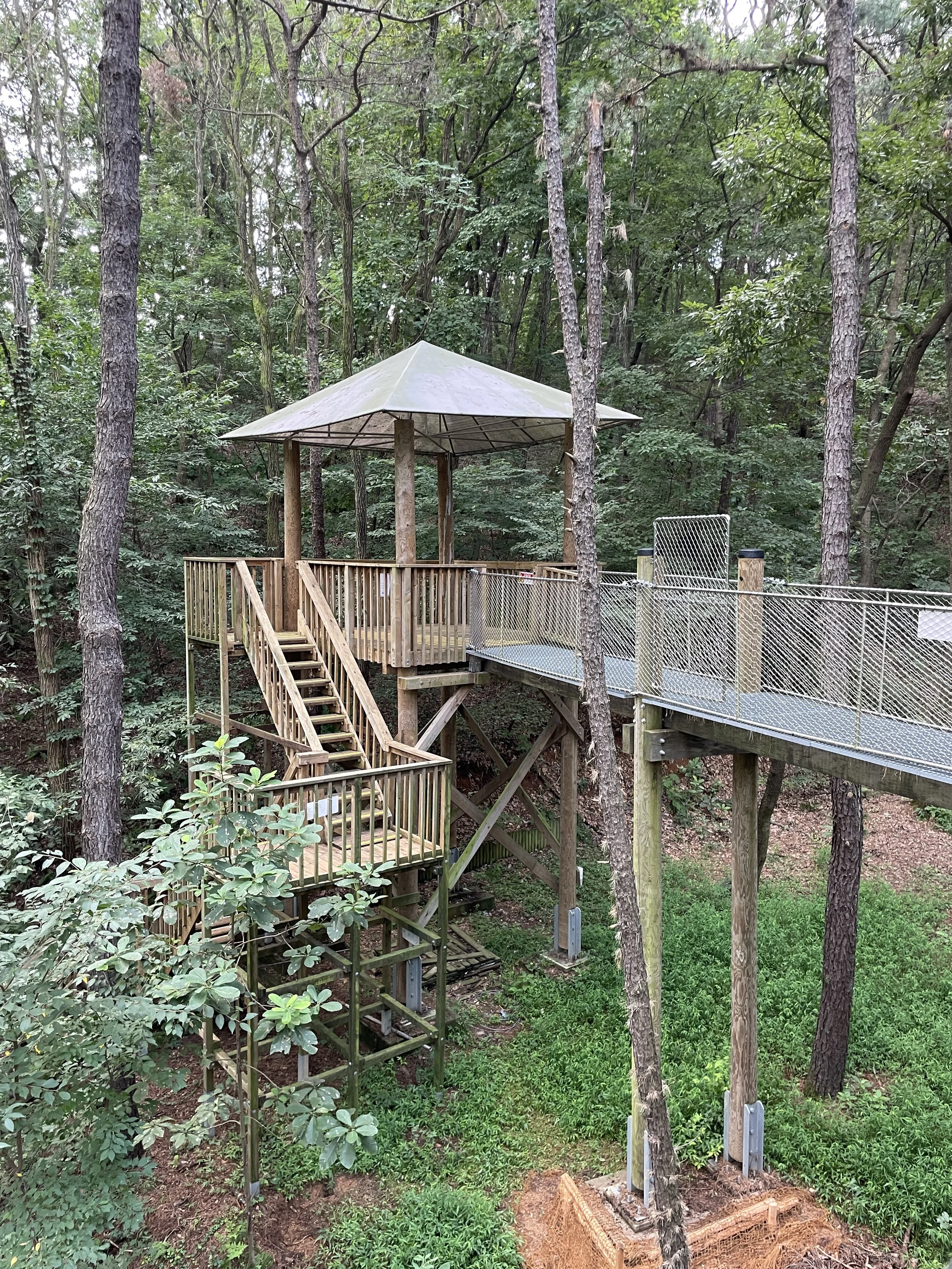 Elevated walkways rise over 20 feet above the forest floor.